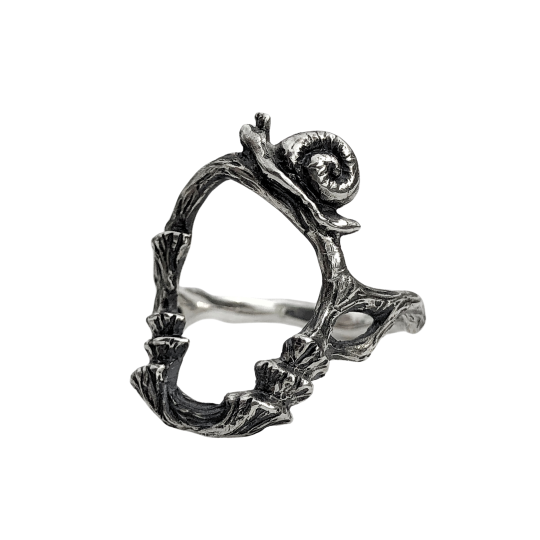 A tiny snail winds its way through a patch of wild mushrooms, a fleeting moment from the forest floor, captured in solid sterling silver.