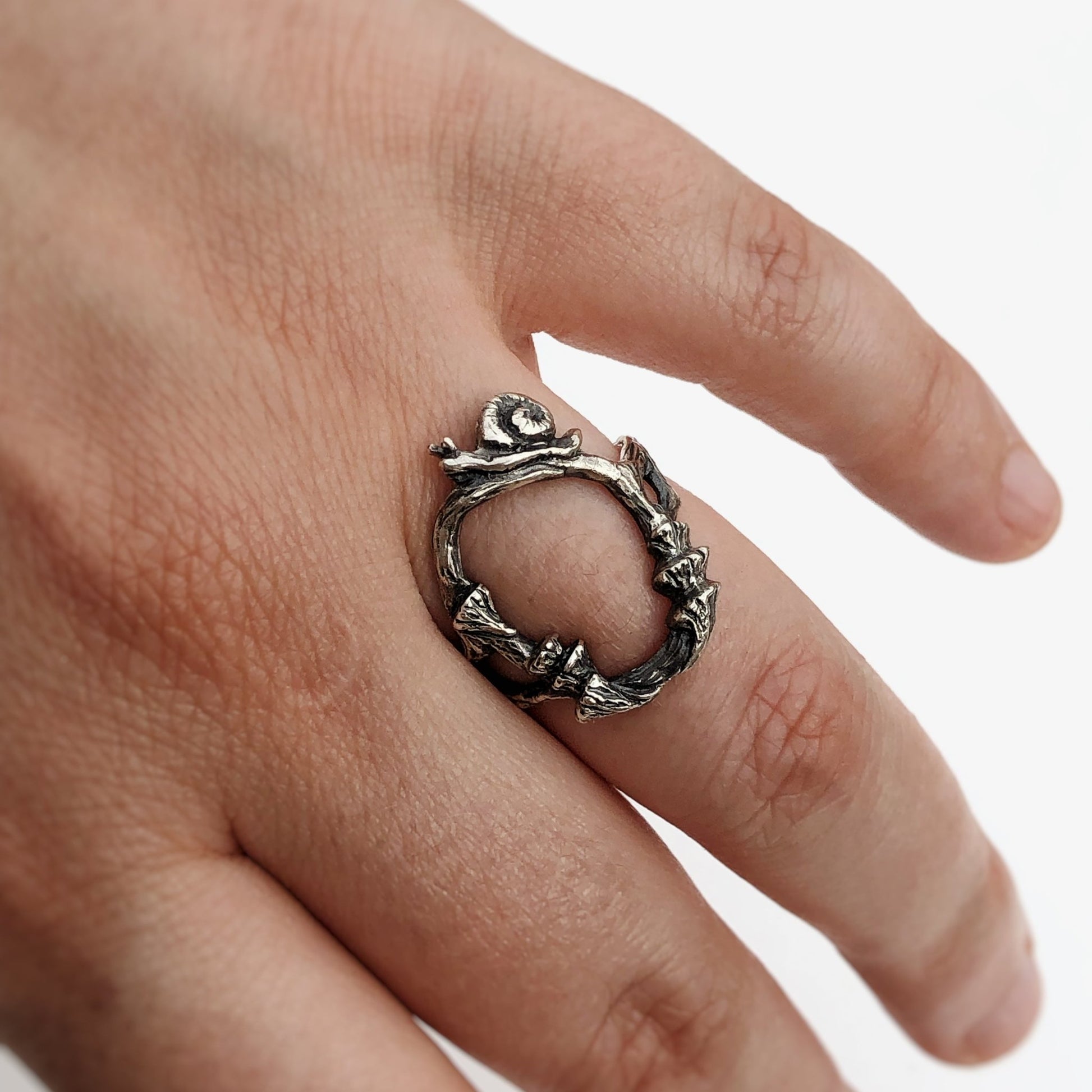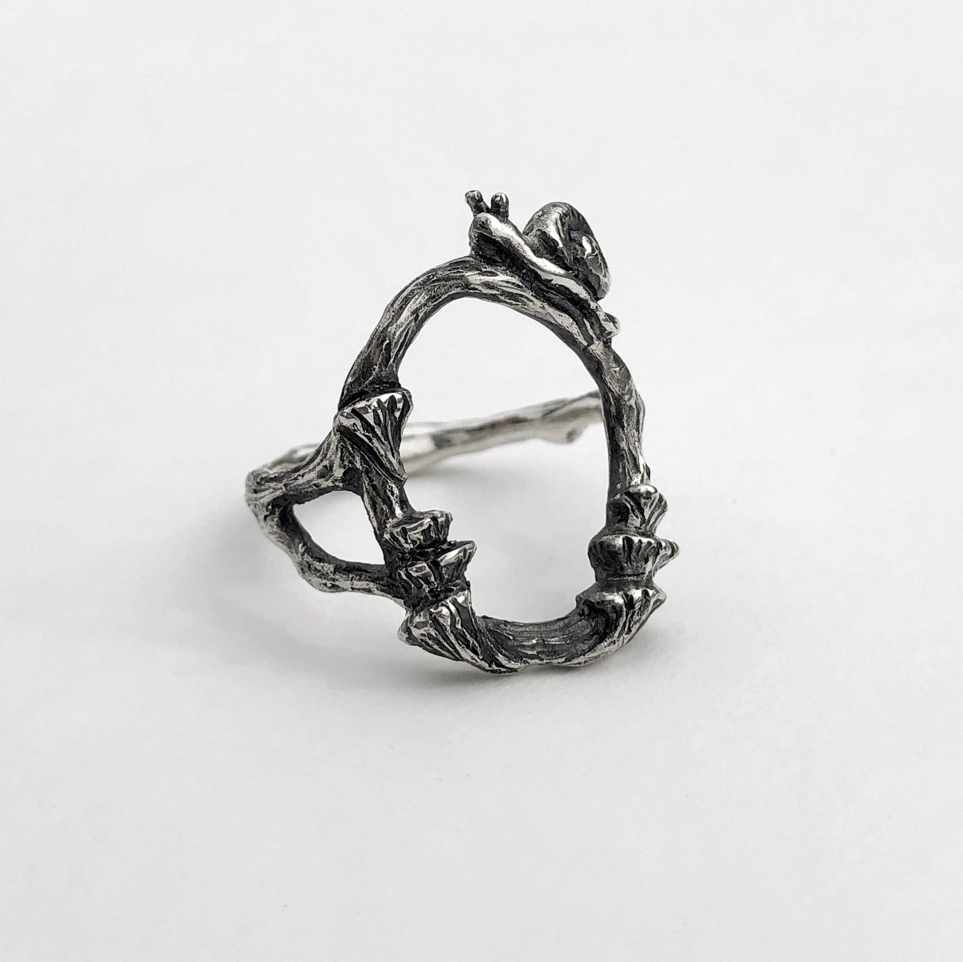 Hand-carved in wax and cast into metal, this sculptural ring evokes a quiet stroll through overgrown meadows and mossy paths, where wonder hides in miniature worlds. With its botanical motifs and whimsical details, it speaks to those drawn to the magic of nature, fairycore aesthetics, and the enchantment of forgotten places, a handmade statement ring that lives between sculptural jewelry, mushroom-inspired design, and forestcore dreams.
