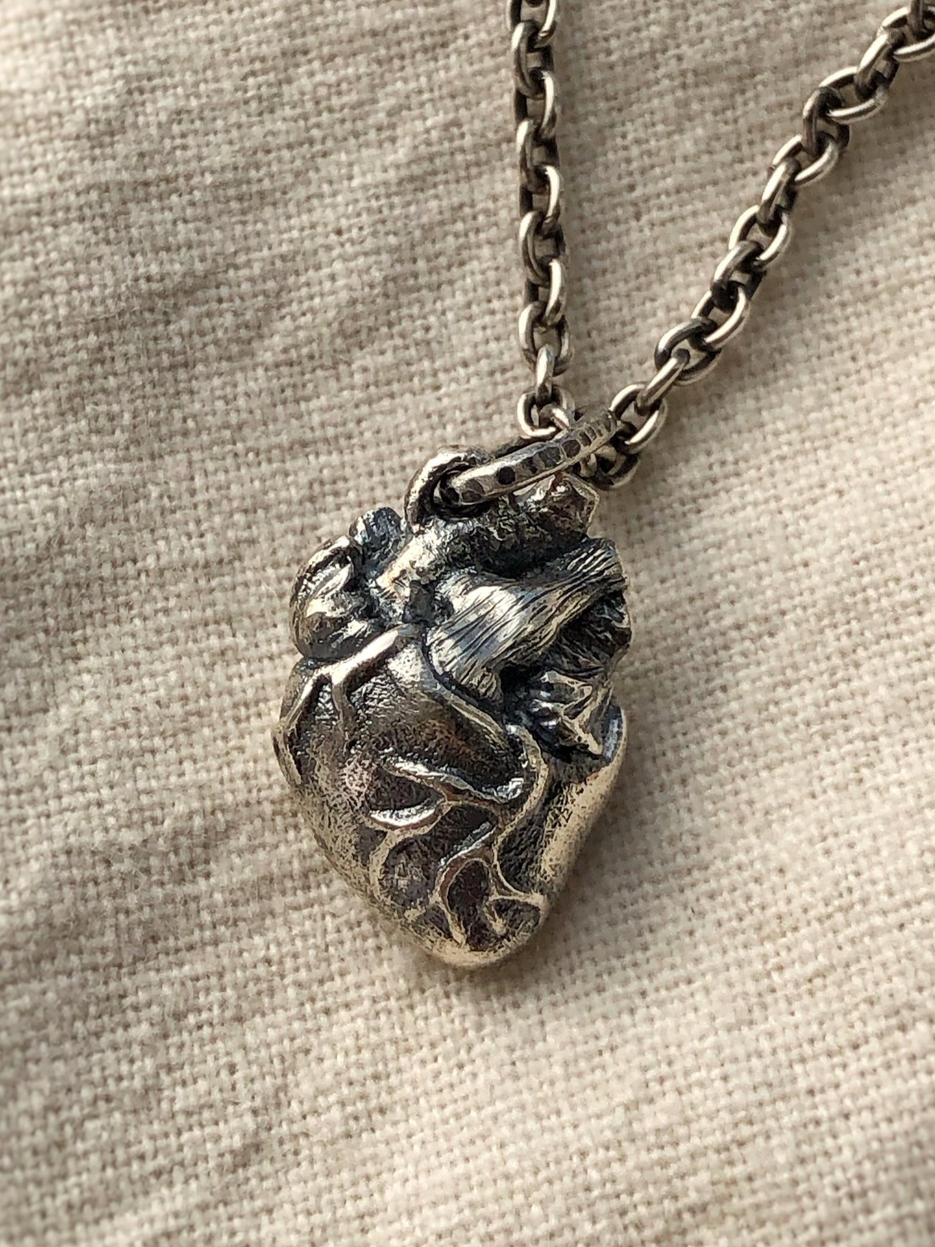 An anatomical heart sculpted in sterling silver. Turn it, and the inside reveals traces of chambers, valves, and arteries.