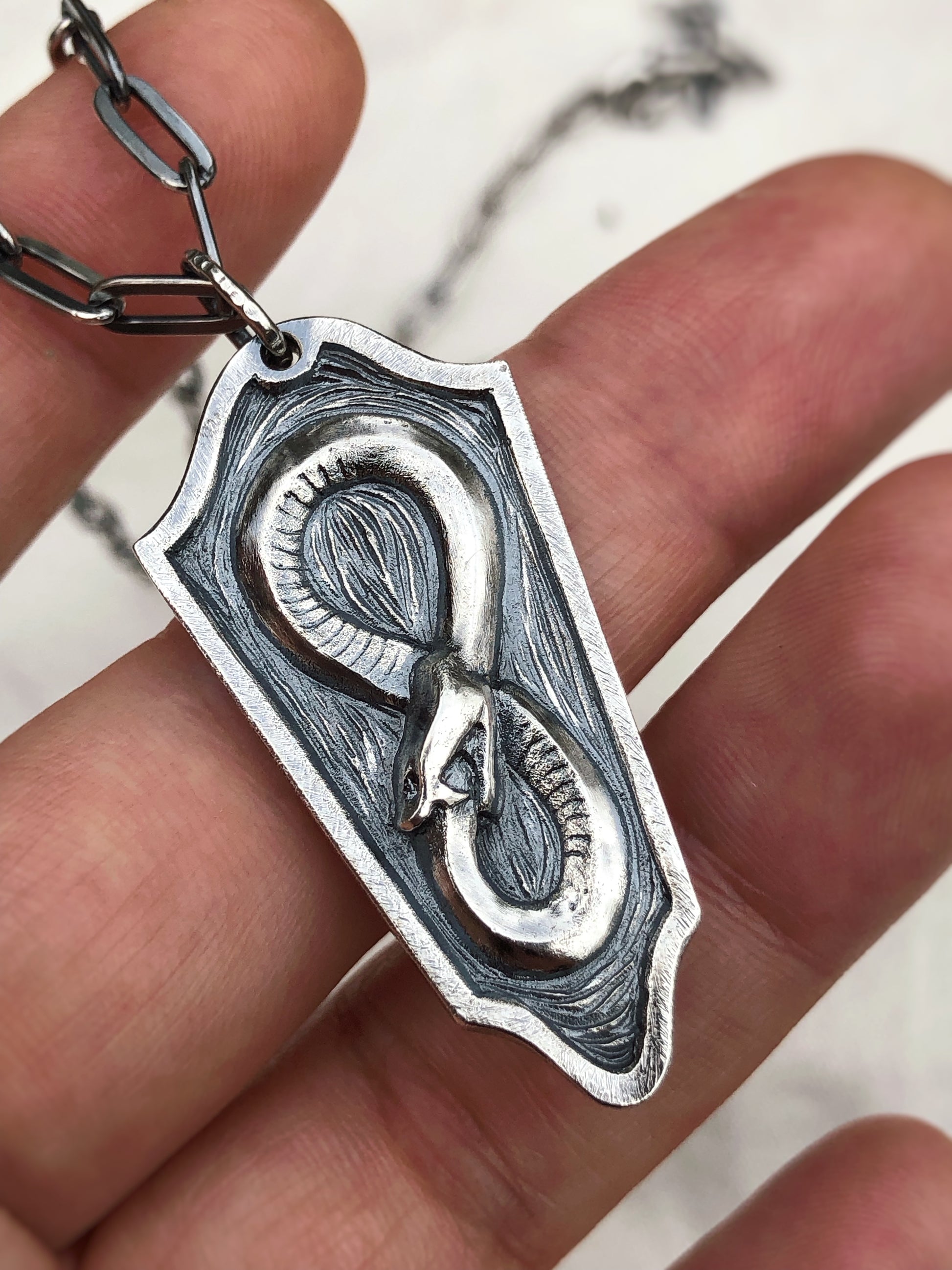 This symbolic pendant holds the rhythm of return and renewal. Its sculptural form carries strength and presence, rooted in serpent symbolism.
