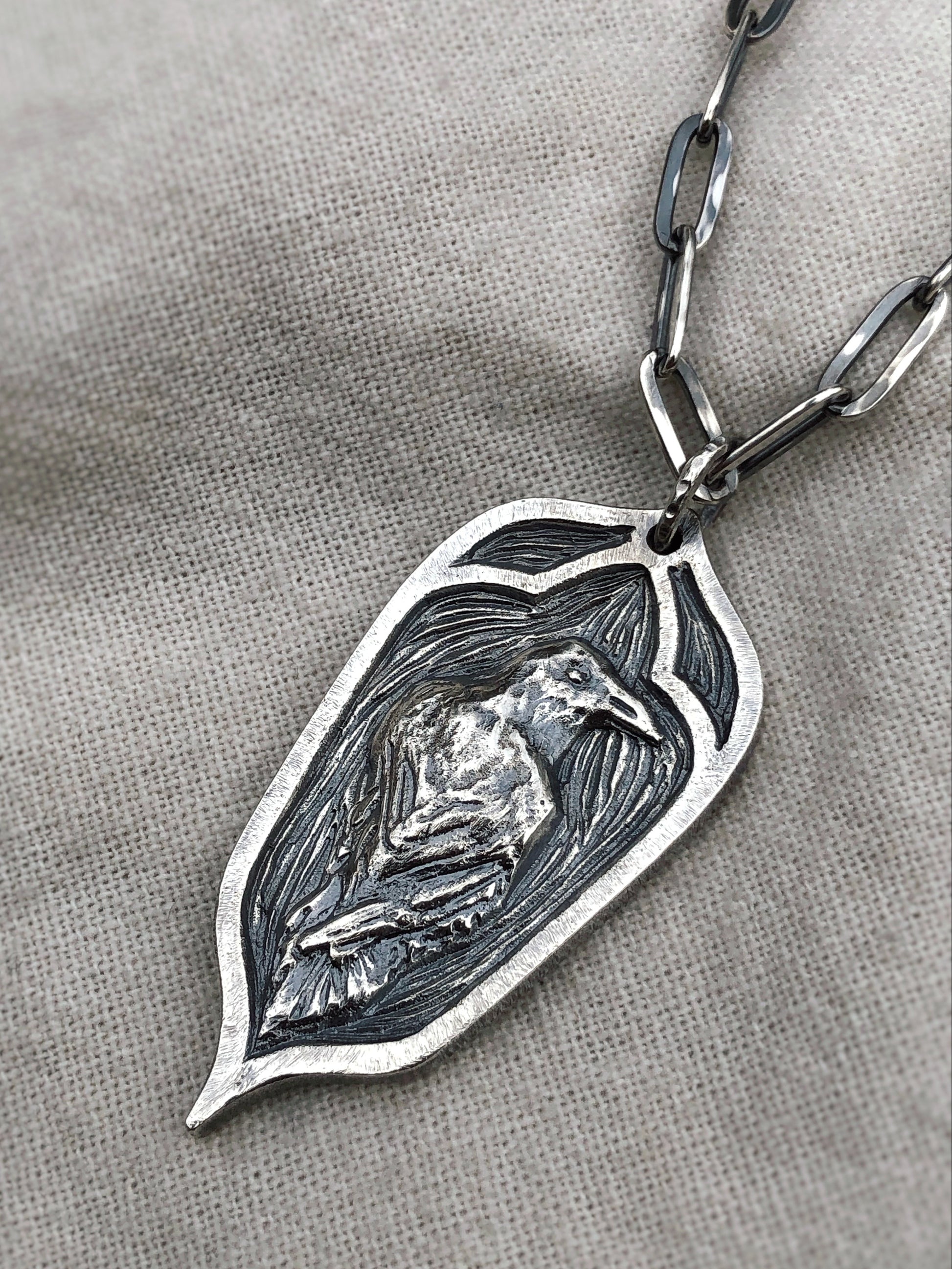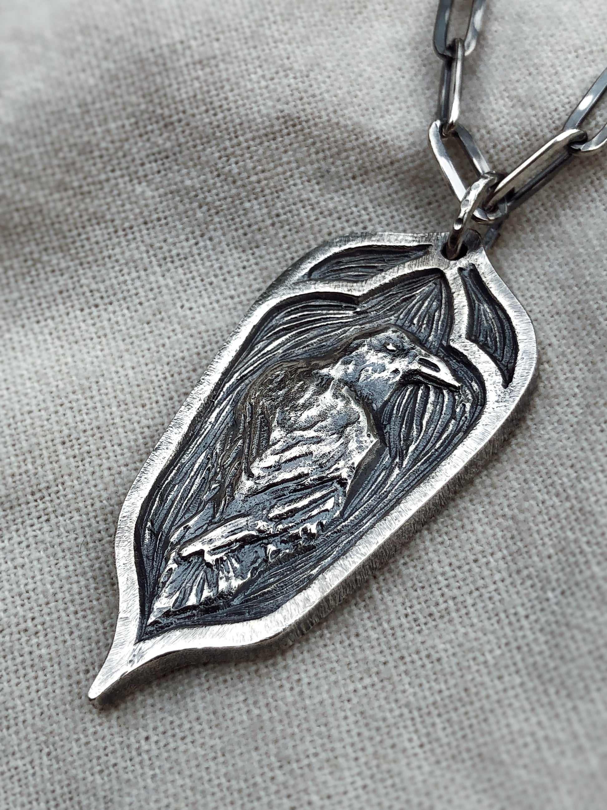 A handcrafted piece of dark jewelry rooted in raven symbolism, for those who keep bright treasures safe.